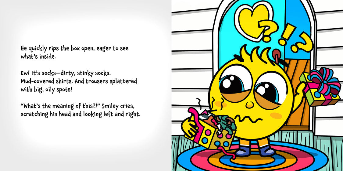 Only… something’s gone very wrong. Instead of pie, Smiley finds dirty socks and muddy clothes. That's not right. That's not right at all! What happened to the trick box?