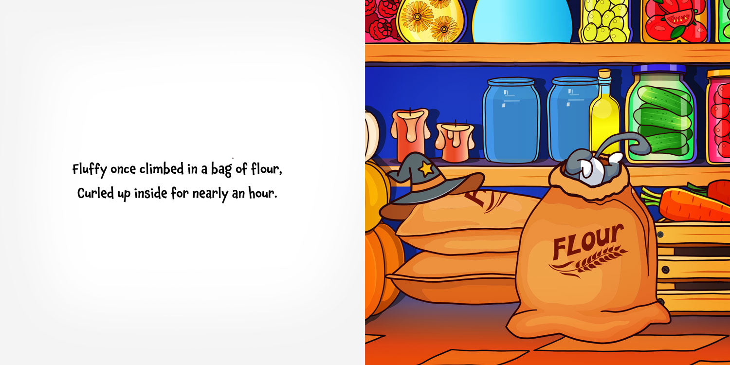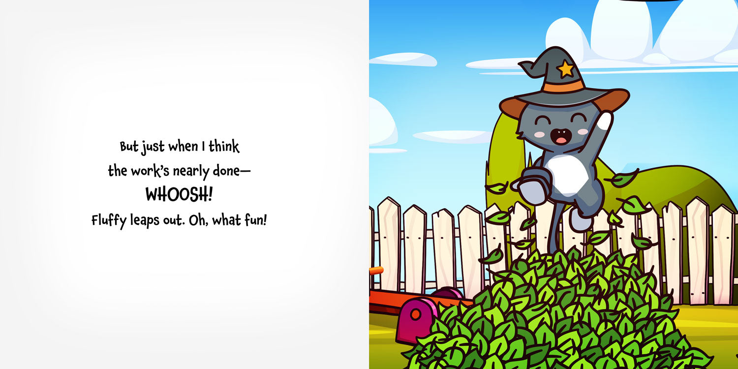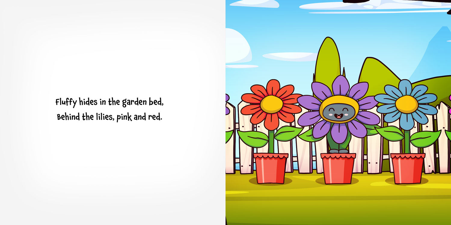 Fluffy the cat loves one thing more than anything… hiding! From the yarn basket to the garden bed, the bag of flour to the postman’s sack, this cheeky, hat-wearing cat is a master of sneakiness. But can YOU spot him before he pops out with a surprise?